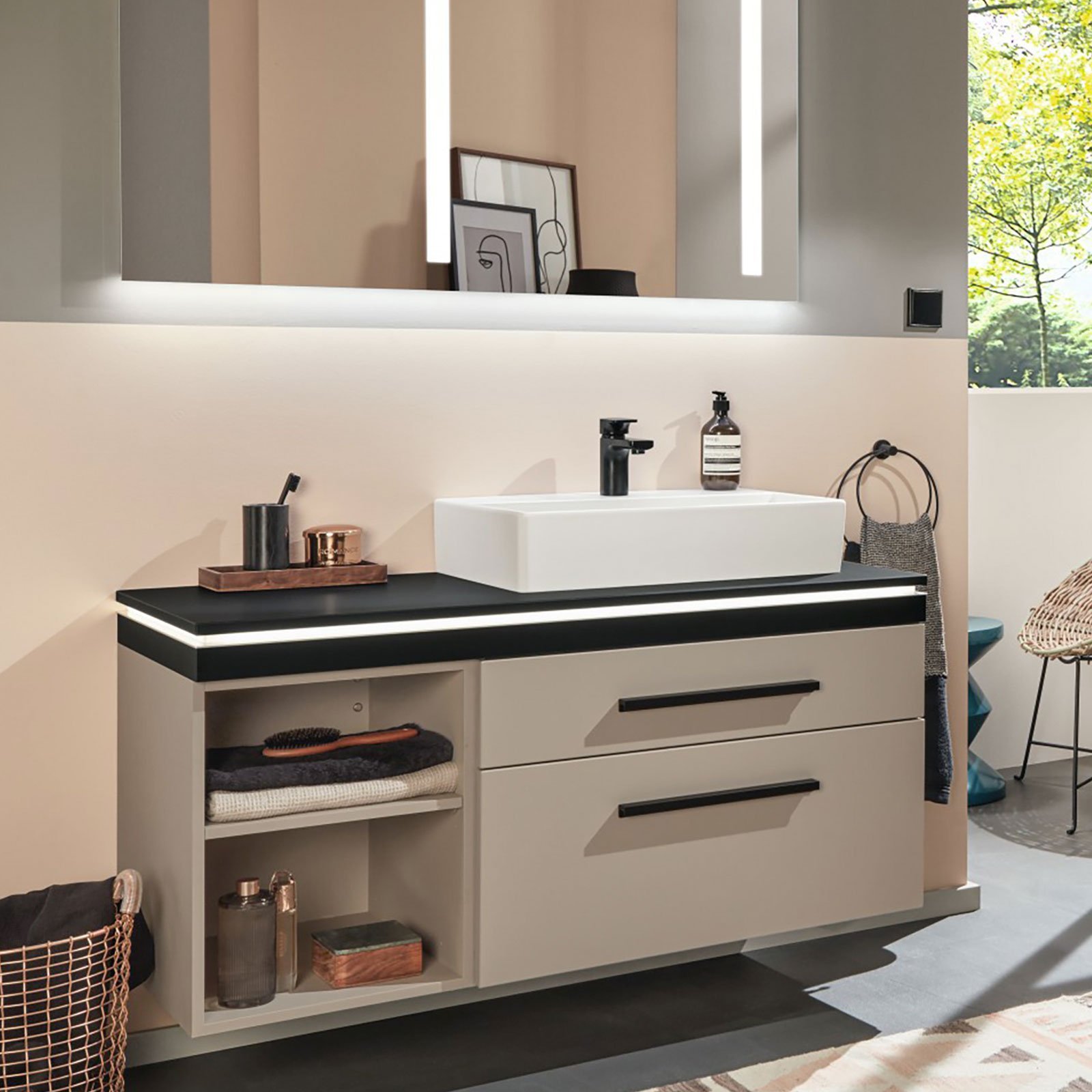 Die 2morrow Platte Light in Vulkan-Matt und die schwarz matten Griffe gebendem Waschplatz einen besonderen Touch. Ergänzt und akzentuiert wird das Bad mit demgeräumigen Mittelschrank in einem warmen Holzton. Die Beleuchtung der Platte und des variablen Reflection Lichtspiegels VIOLA ist durch intelligente Lichtsteuerung in Helligkeit und Lichtfarbe regelbar. Zeitgemäßer Look mit innovativer Technik.