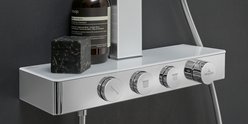 Verschiedene Glaselemente sorgen für einen hochwertigen Look. Die Thermostate sind für die Dusche mit einer Funktion und für die Badewanne mit zwei Funktionen erhältlich. Praktisch ist die Glasablage die sich perfekt in das Design integriert.